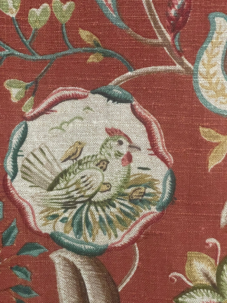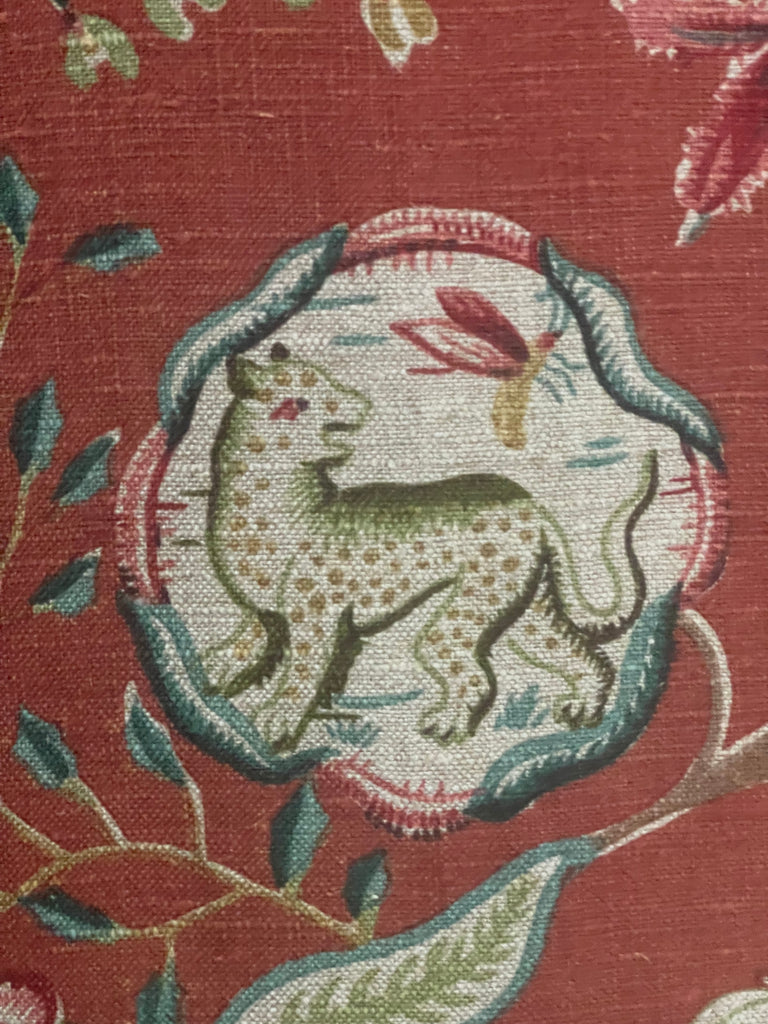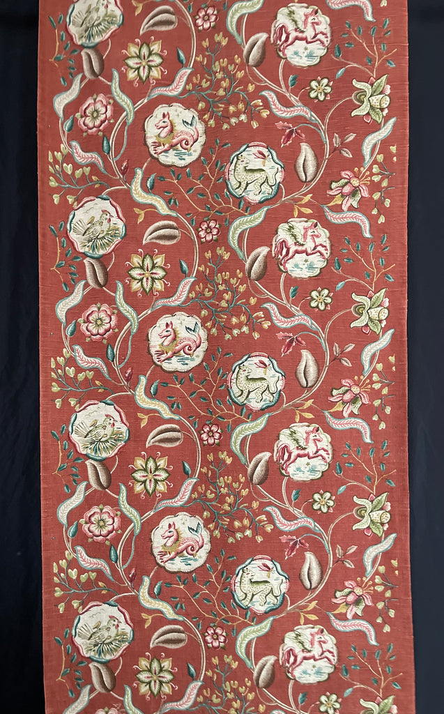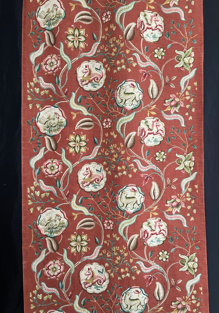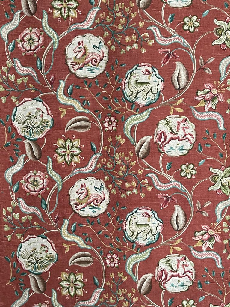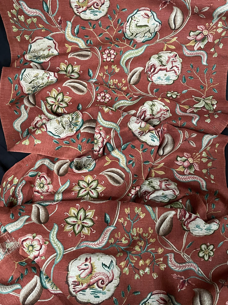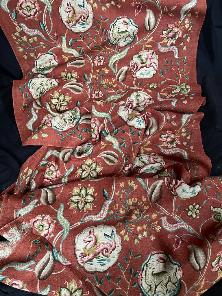 An amazing find this fabulous printed linen features a highly stylized, mythical creatures within a decorative medallions, which is part of a larger Jacobean-style botanical pattern.