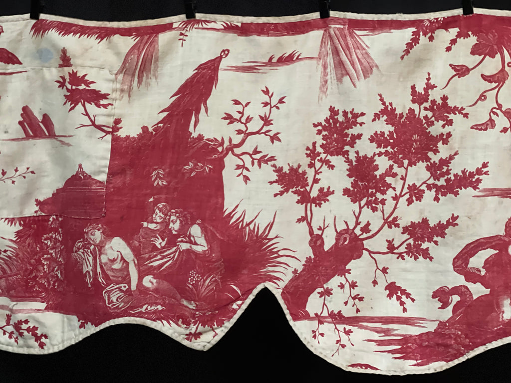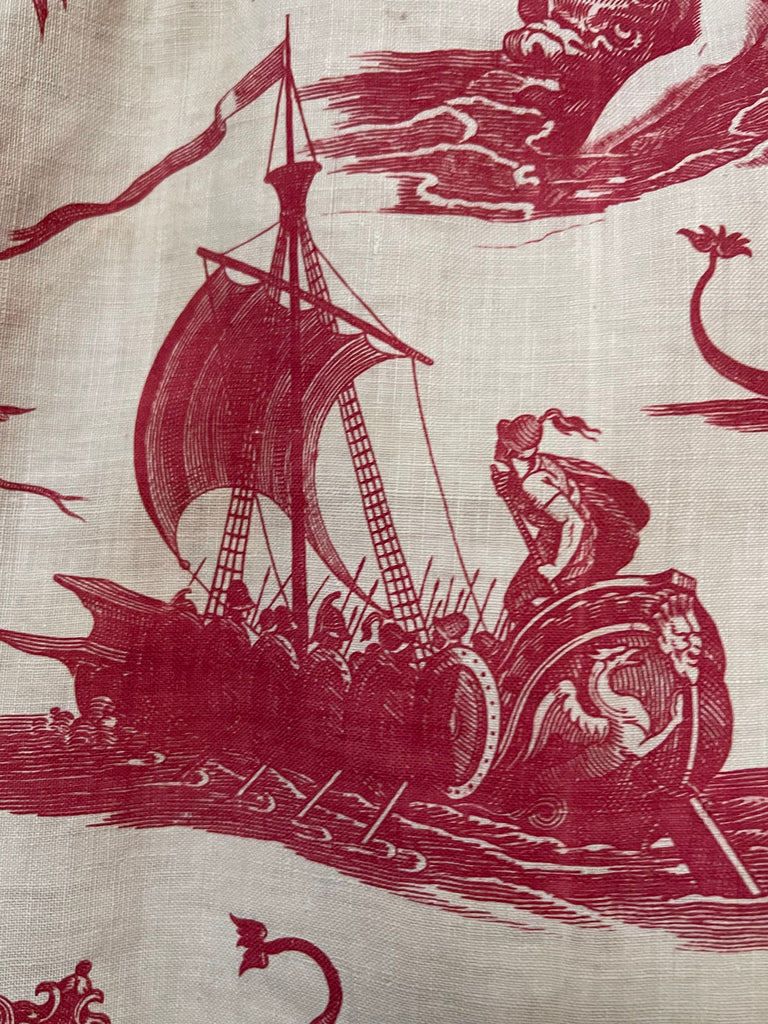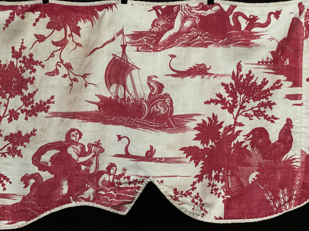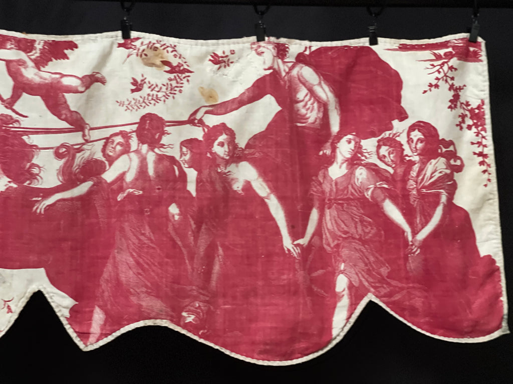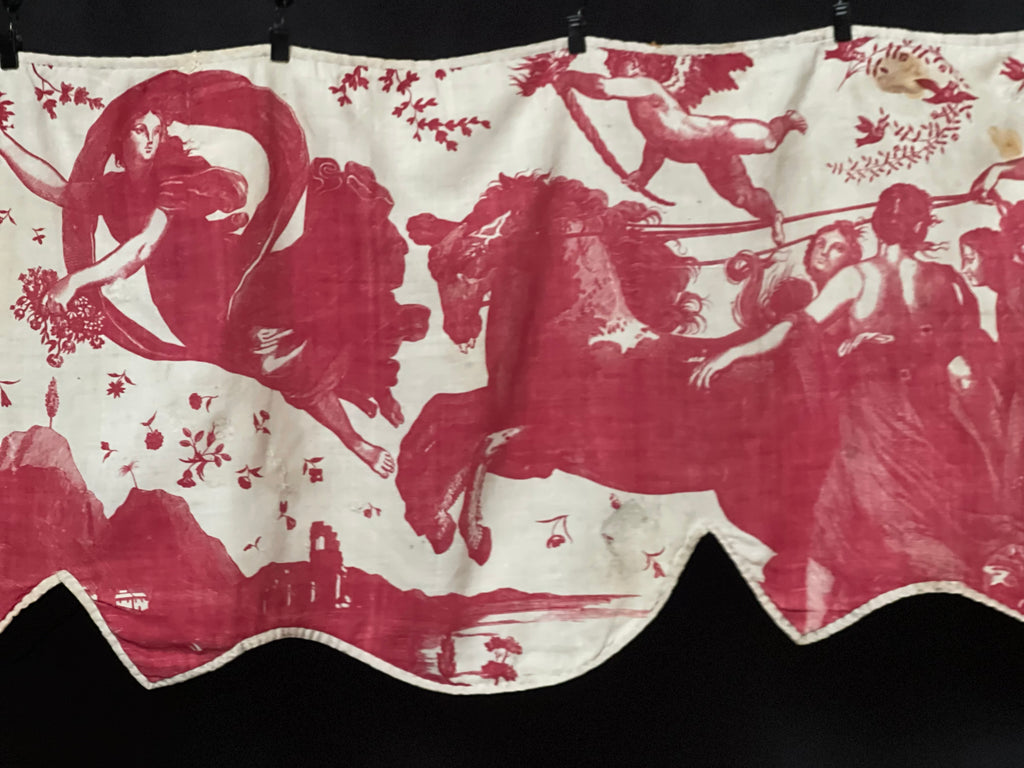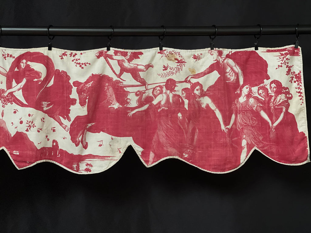A superb long Toile de Nantes pelmet with a print called ‘Chariot of Dawn’, a beautiful design dating from the 18th century.