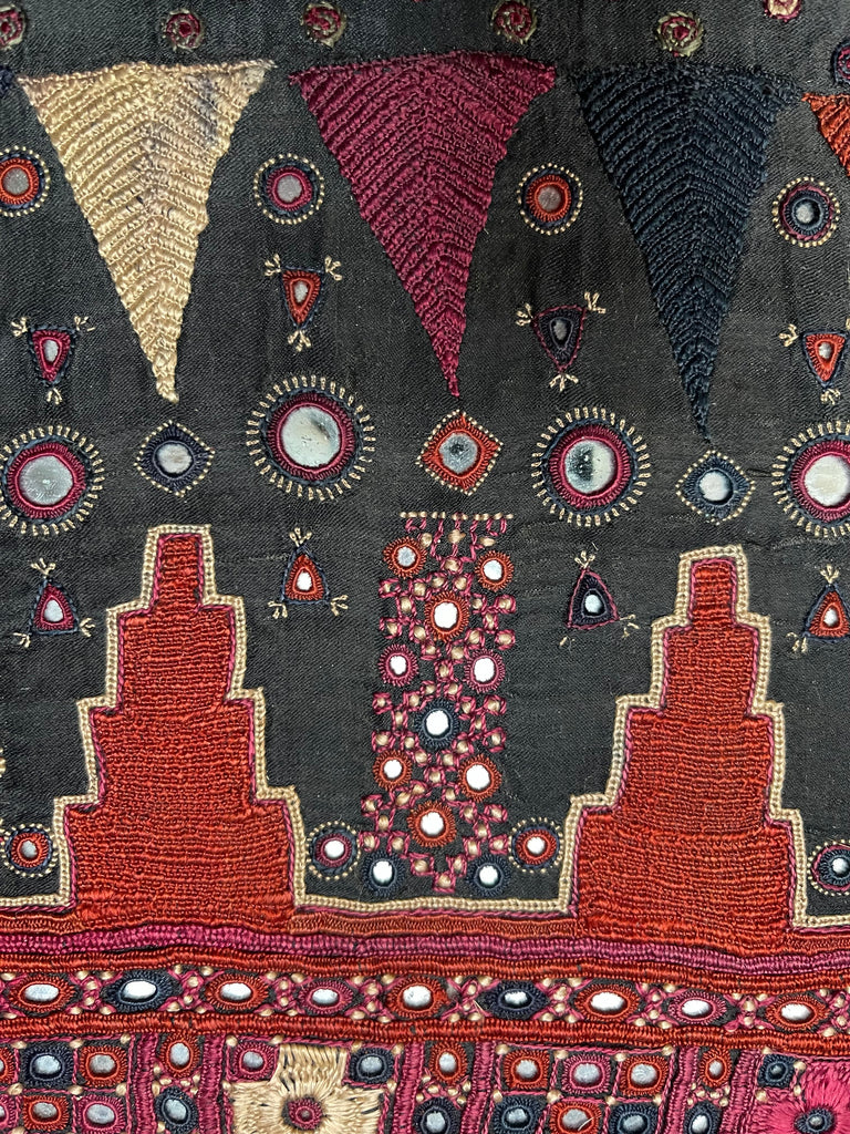 Skillfully handworked this has to be seen to be believed. The detailing is extraordinary with tiny stitching and detailing. Inset with tiny shisha mirrors designed to catch the light.