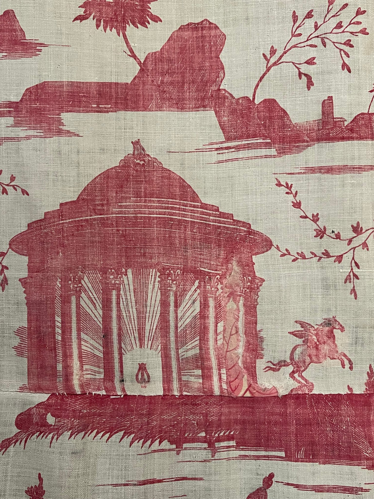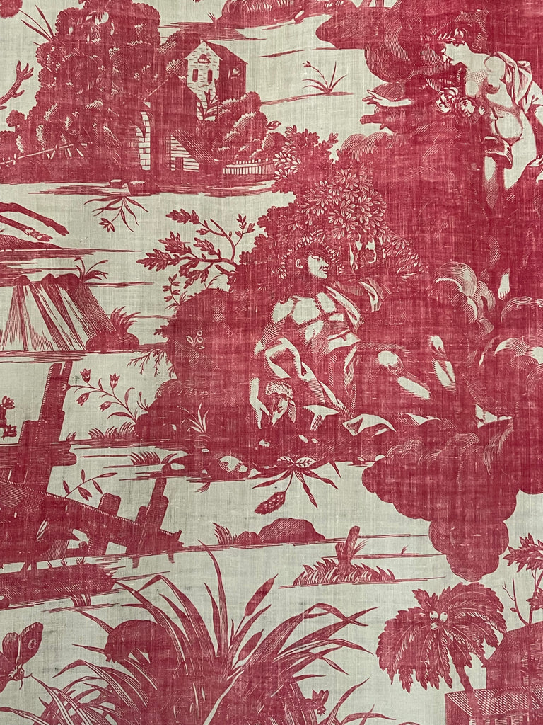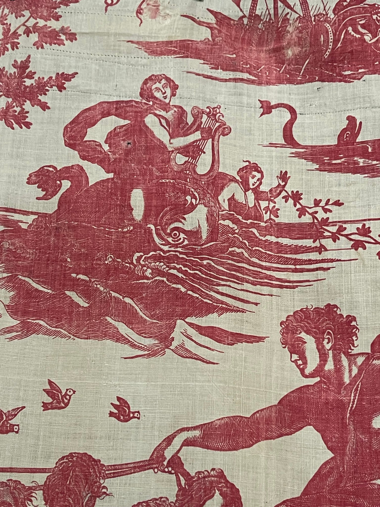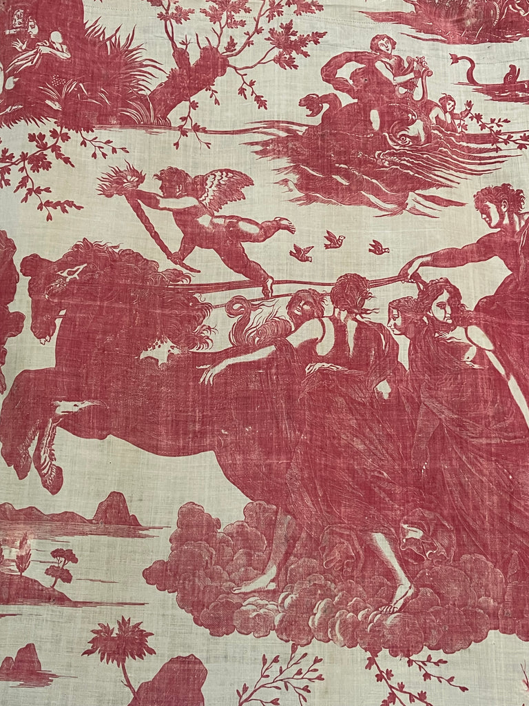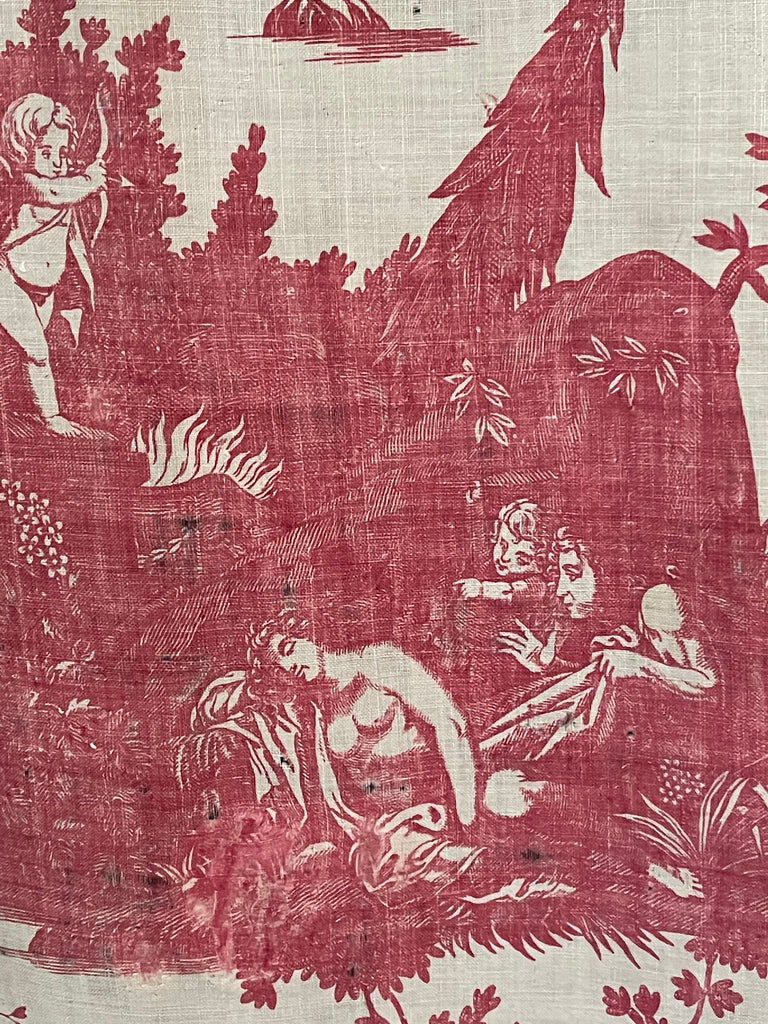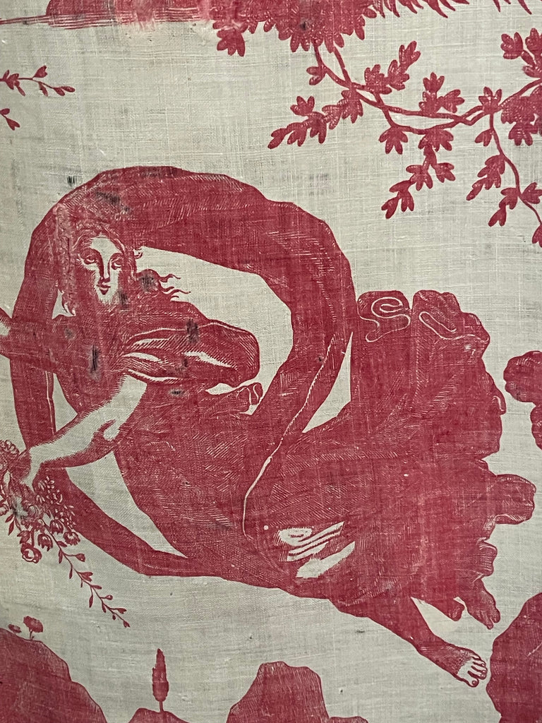 This is joined to a panel of antique Toile de Jouy, specifically the "Diane et Endymion" pattern manufactured by J. P. Meiller in Beautiran, France, circa 1785-1792.