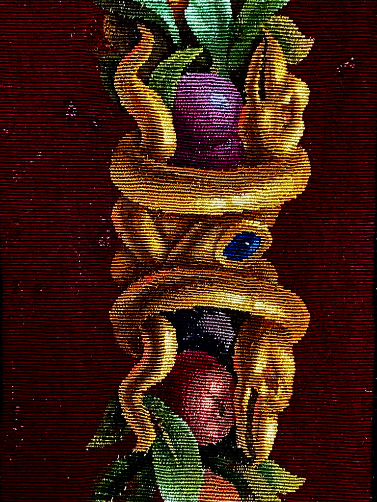 With a central motif of intertwining golden serpents with bowers of fruits and flowers on either side the work in this small piece is of the highest quality.