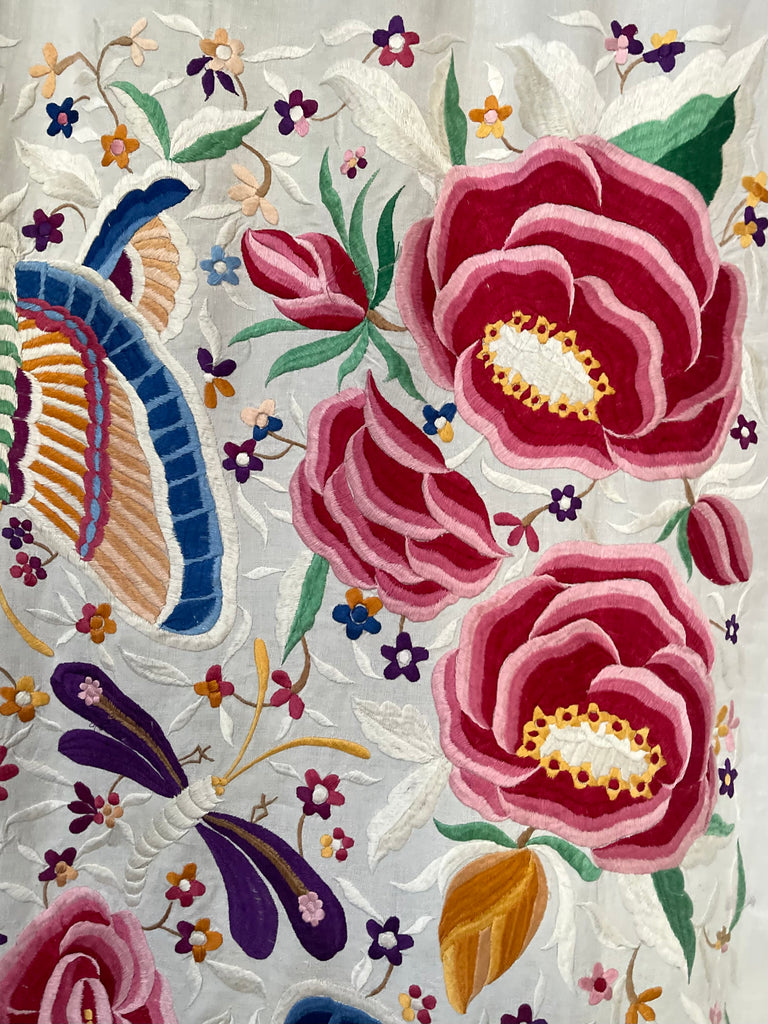 Antique Embroidered Bedcover Throw Curtain with Butterflies Florals Dragonflies: C20th Mexico