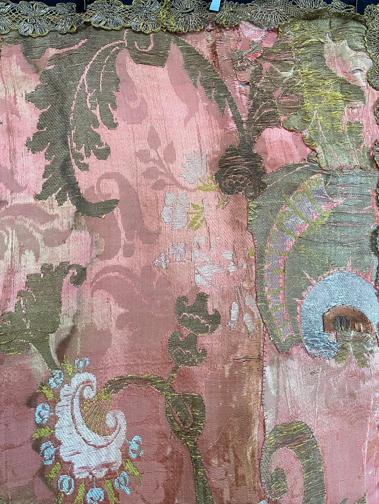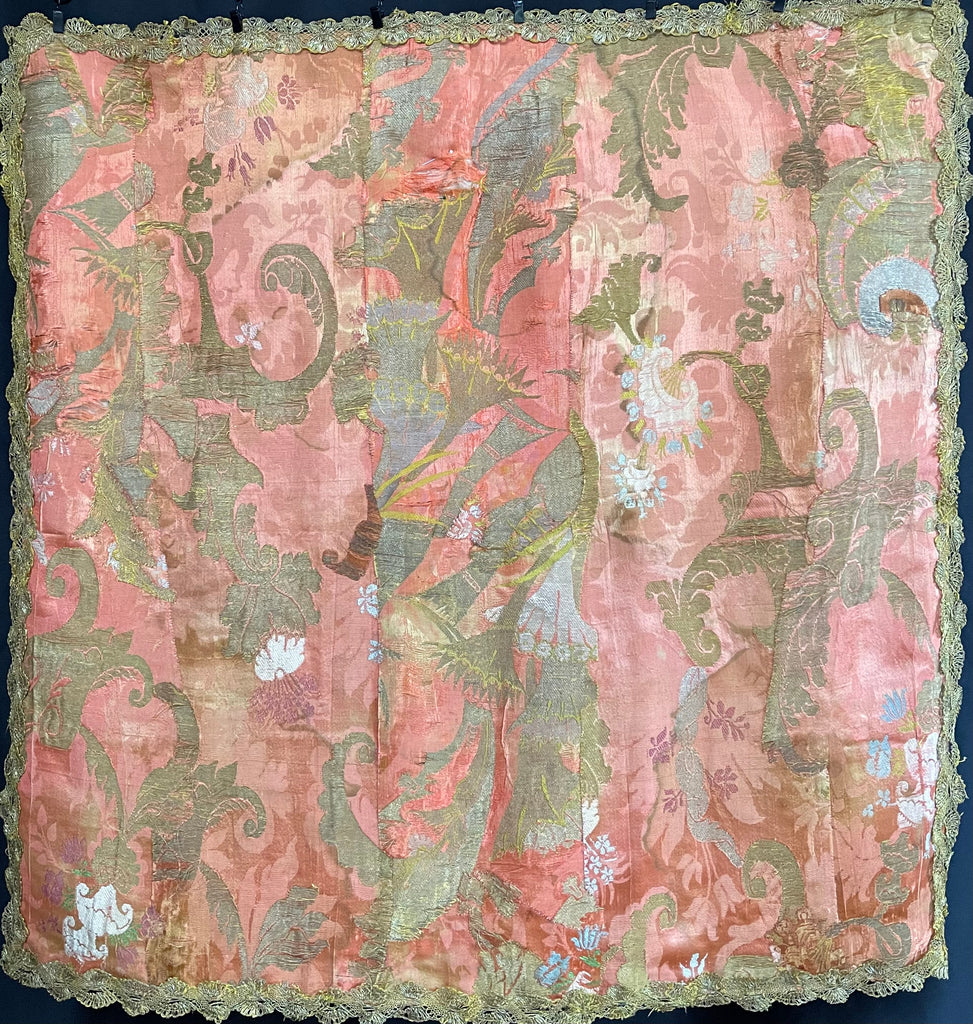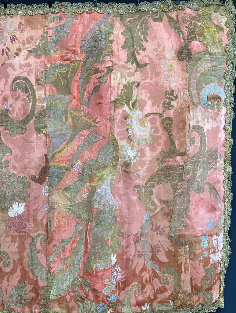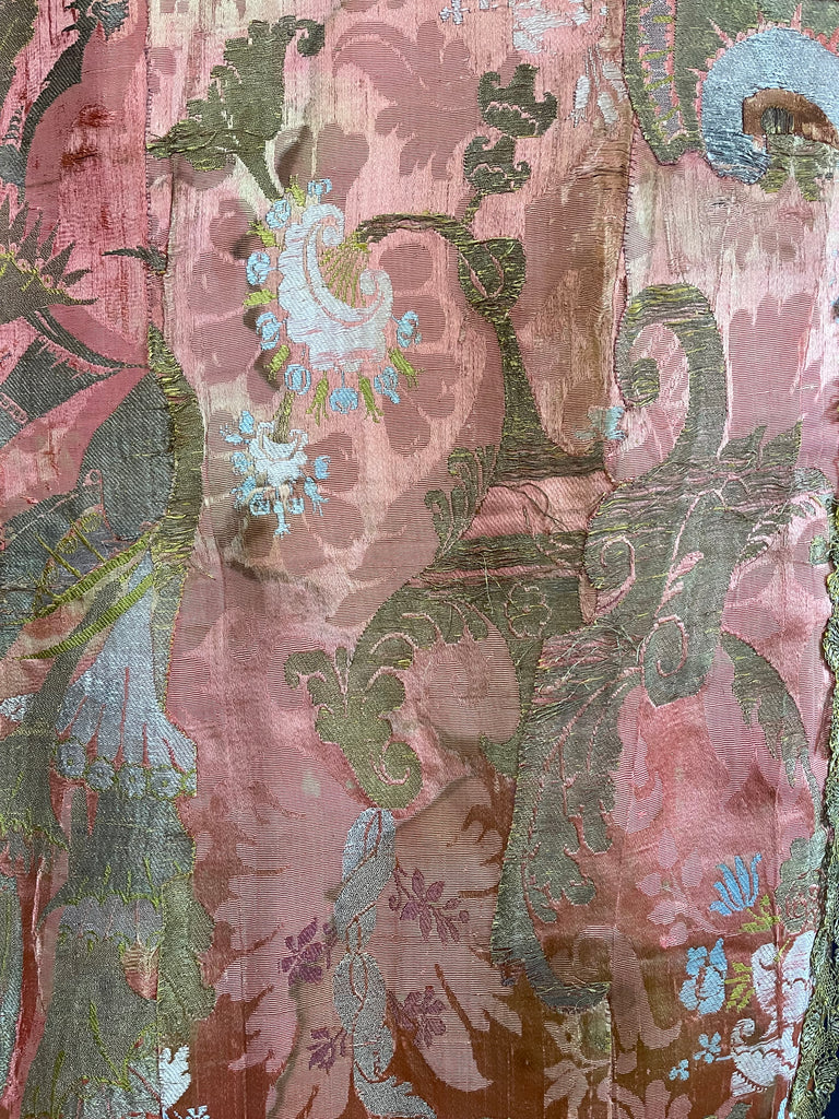 This French silk ground damask textile panel, decorated with intricate brocaded patterns of floral and foliate sprays. Produced between approximately 1695 and 1720, typical of European "Bizarre silks”.