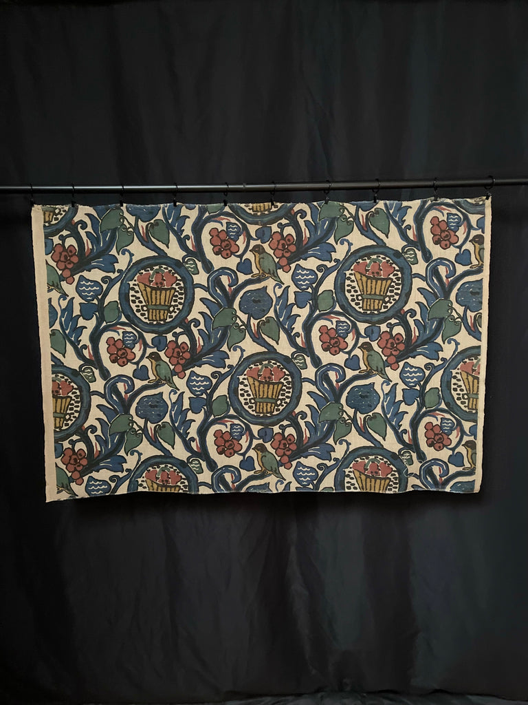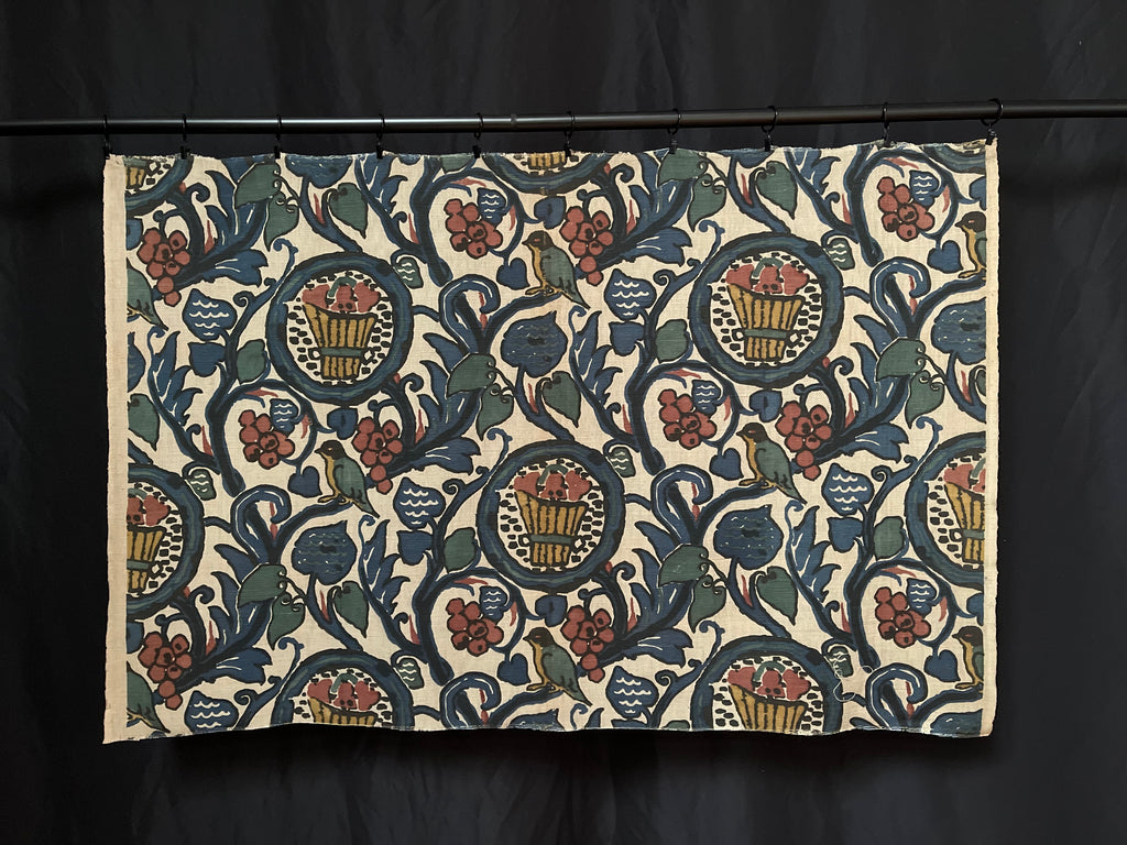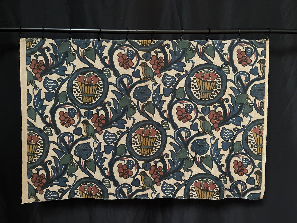 A print on linen of naive birds perched on meandering blue and black outlined branches with unfurling dark green leaves. Encircled flowers in baskets are set amongst the foliage. The linen is an upholstery weight.