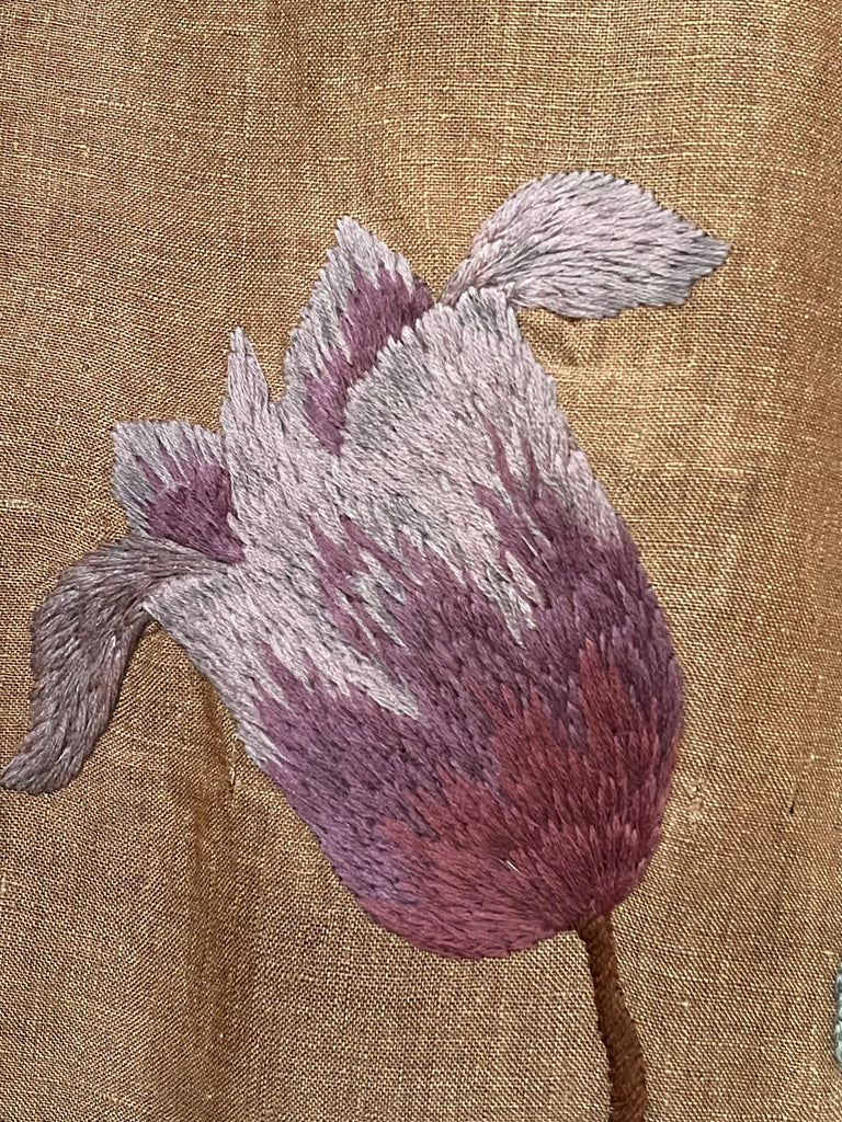 With stunning foliage and florals worked in a wide variety of stitches and techniques on a tobacco coloured linen. Perfect for an interiors project.