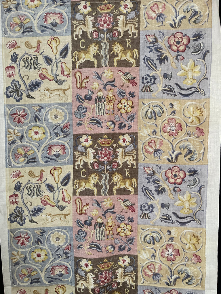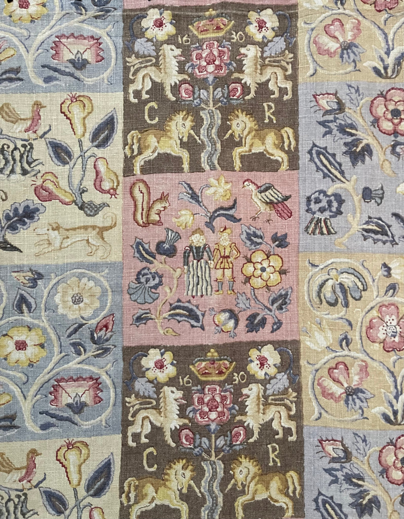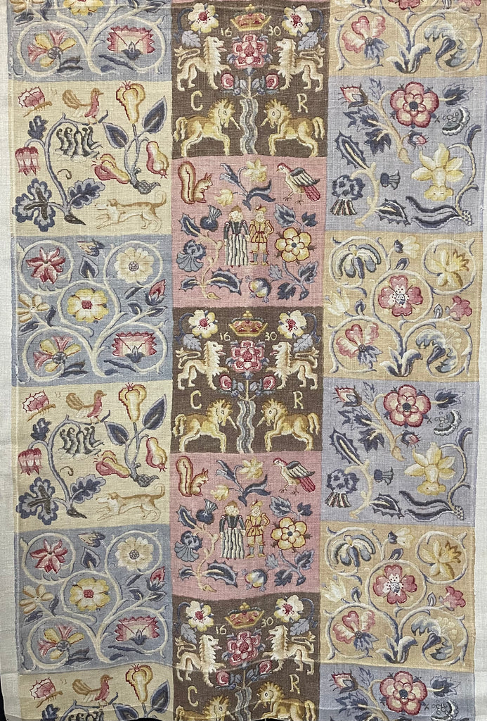 Printed in soft pastels with Royal Symbolism,one panel prominently displays the initials "C R" flanking a central floral motif. These initials likely stand for Carolus Rex, referring to King Charles I.