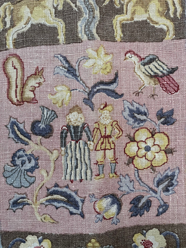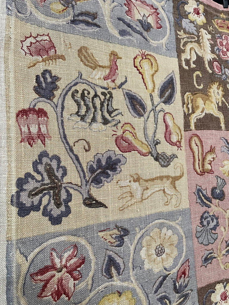 Charming Jacobean Revival Printed Linen Panel with Figures, Animals, Florals: C1920 England