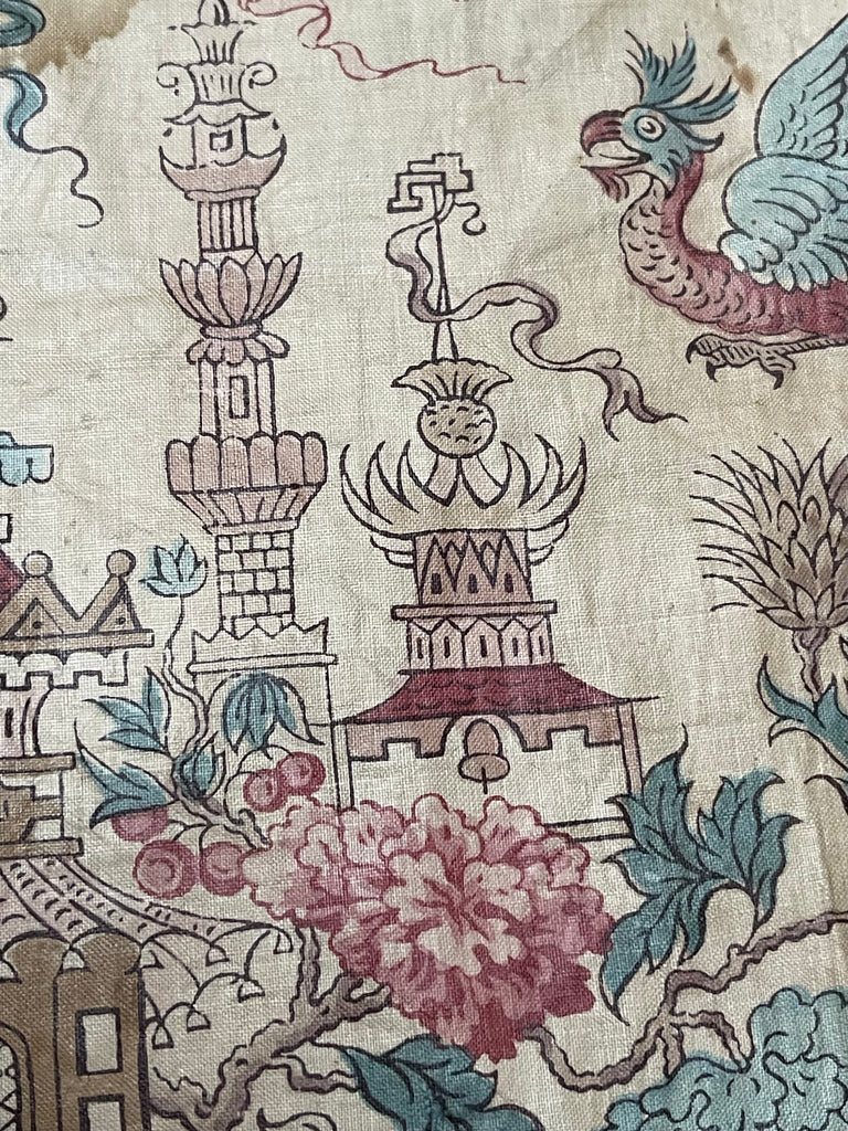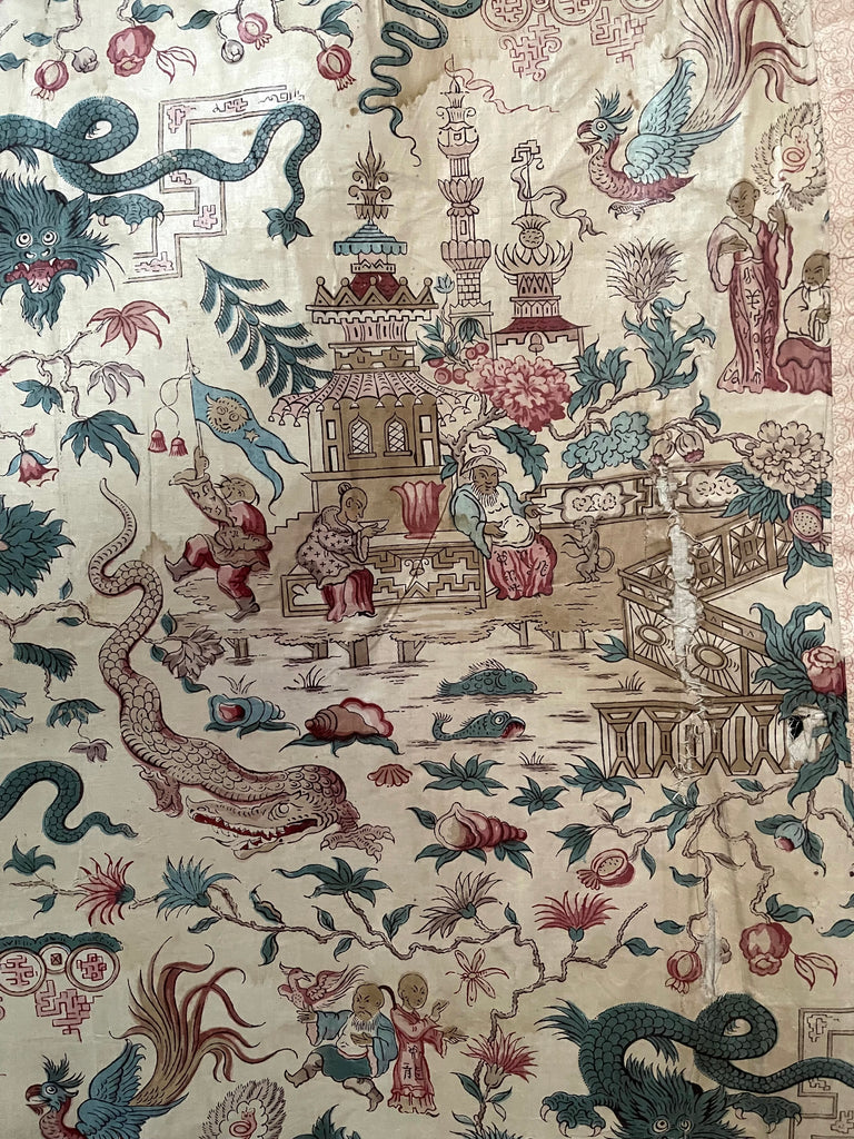 An incredibly rare find, this extraordinary chinoiserie glazed chintz with a plethora of exotic animals, dragons, crocodiles, snakes etc.