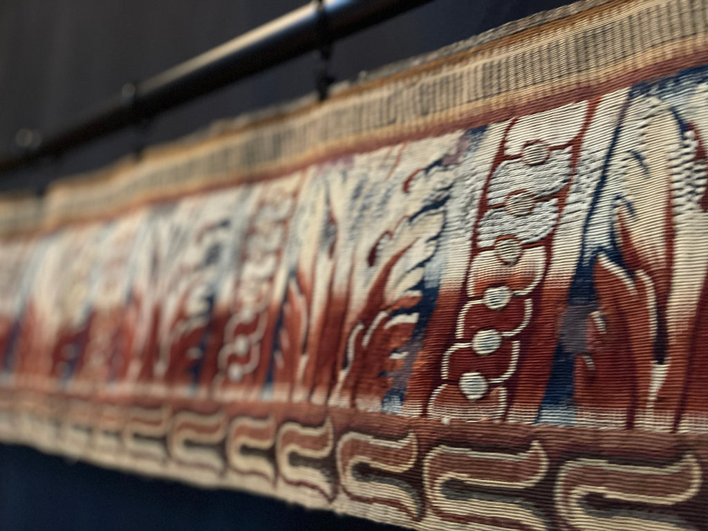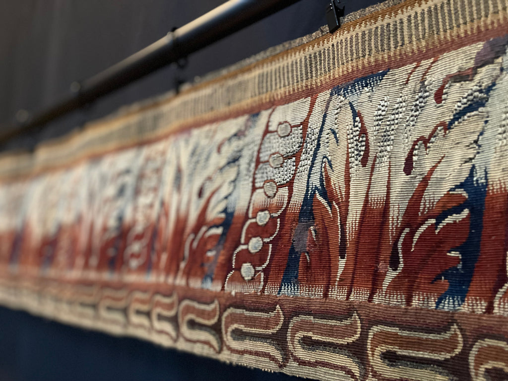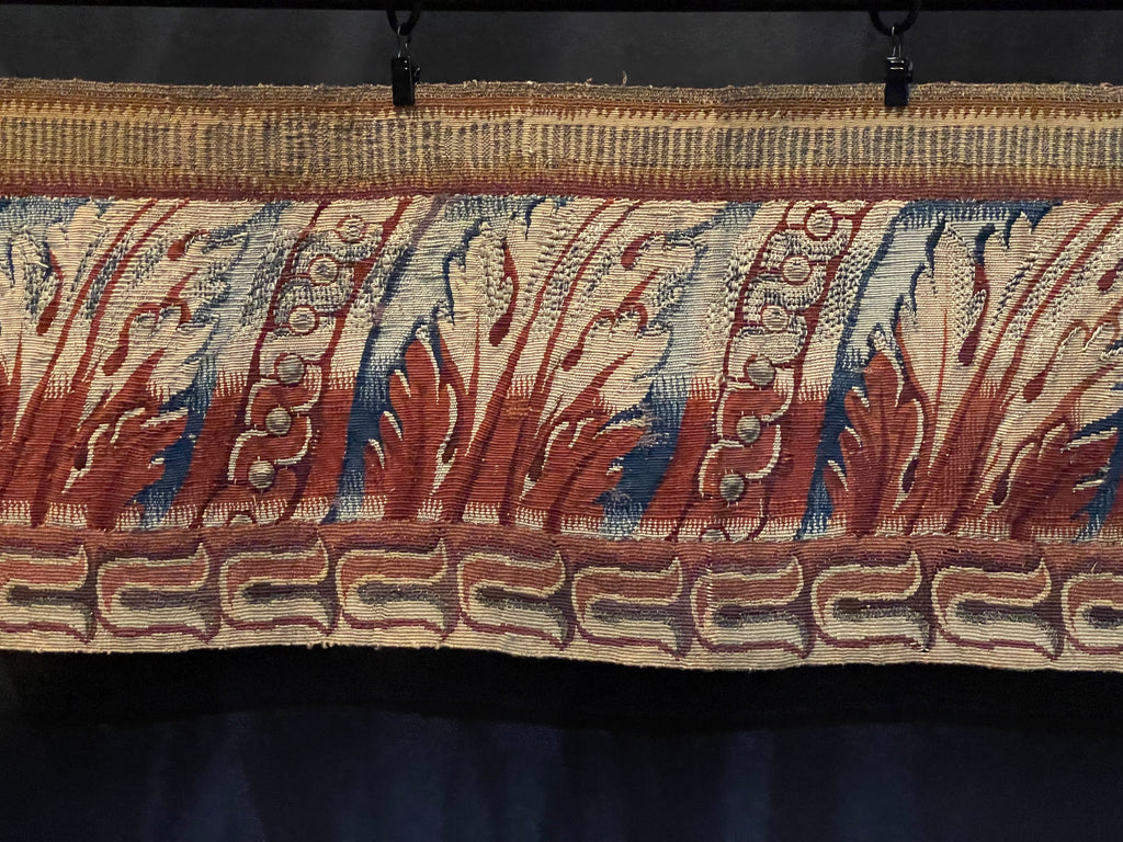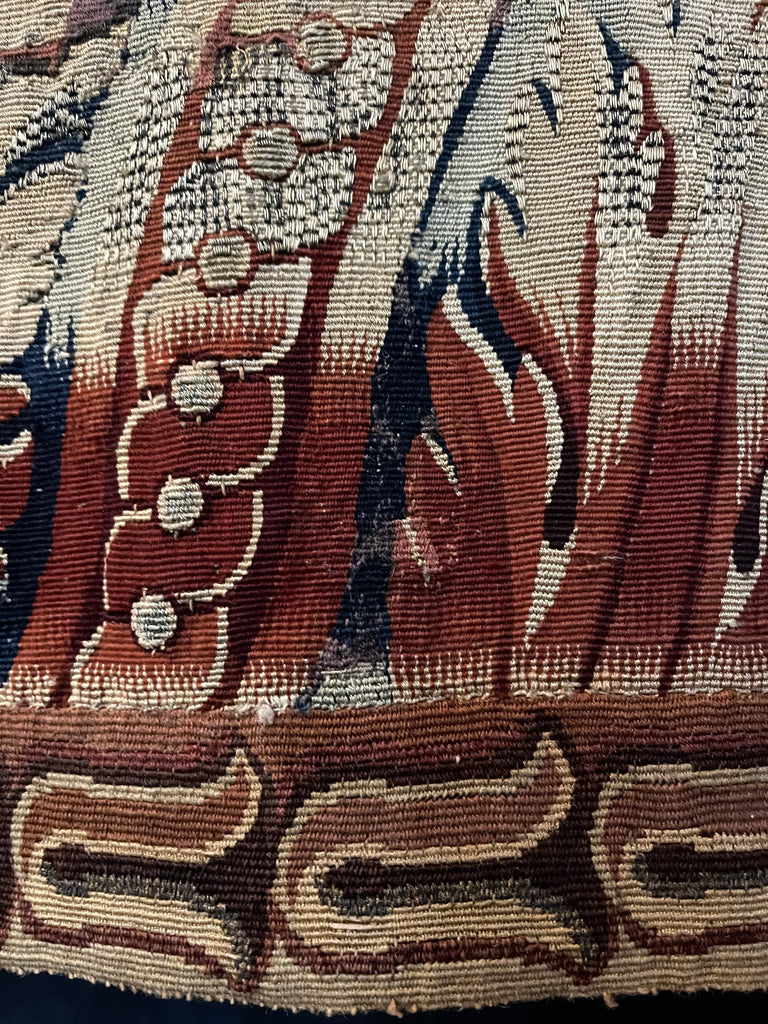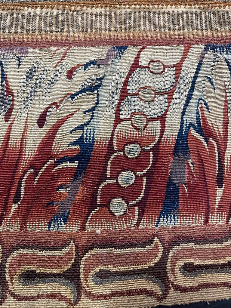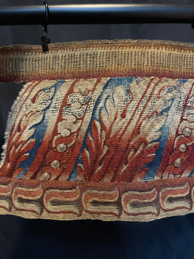 Finely handwoven in wool and silk threads over a metal thread base. Part of the metal thread weaving you can see at one side and in some of the leaf designs where the top threads have slightly worn leaving the metal threads exposed.