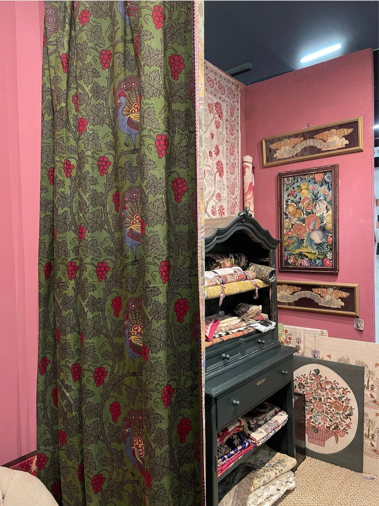 A block printed textile from the Arts and Crafts era, with peacocks and grapevines.