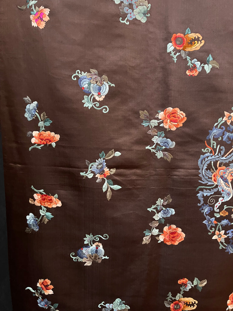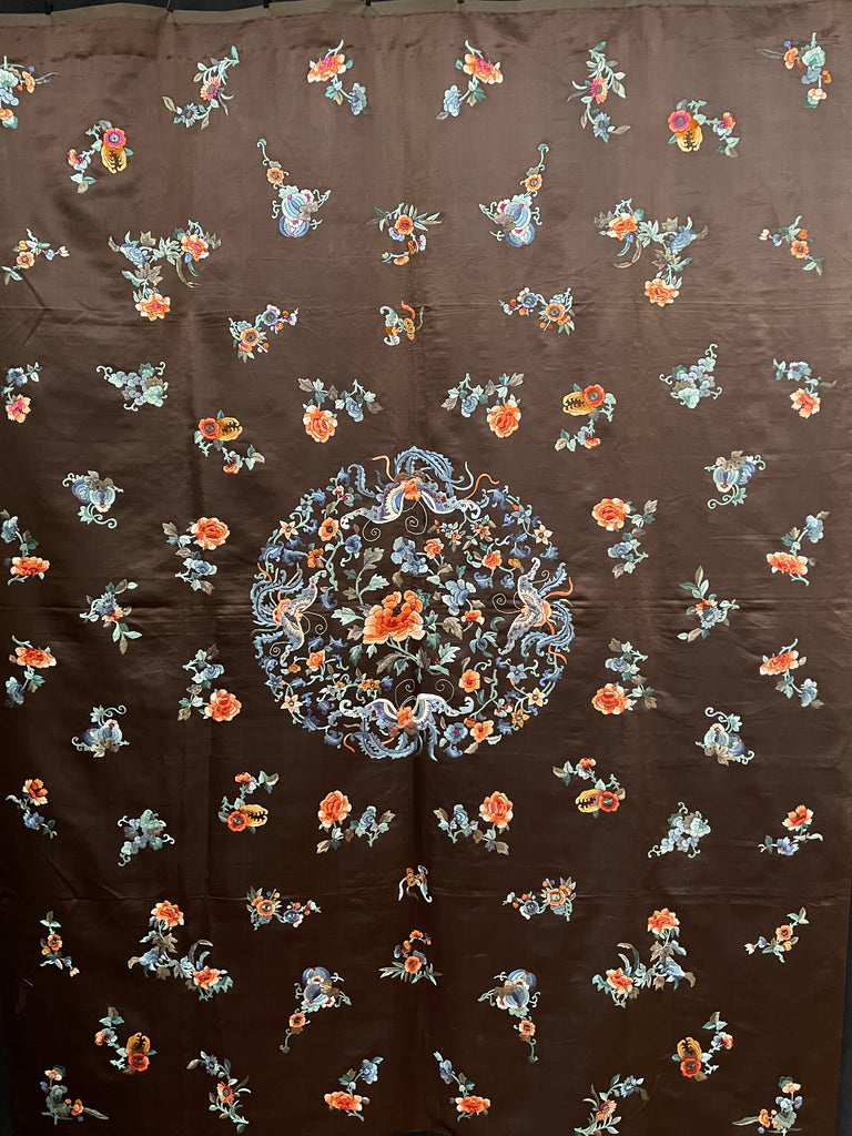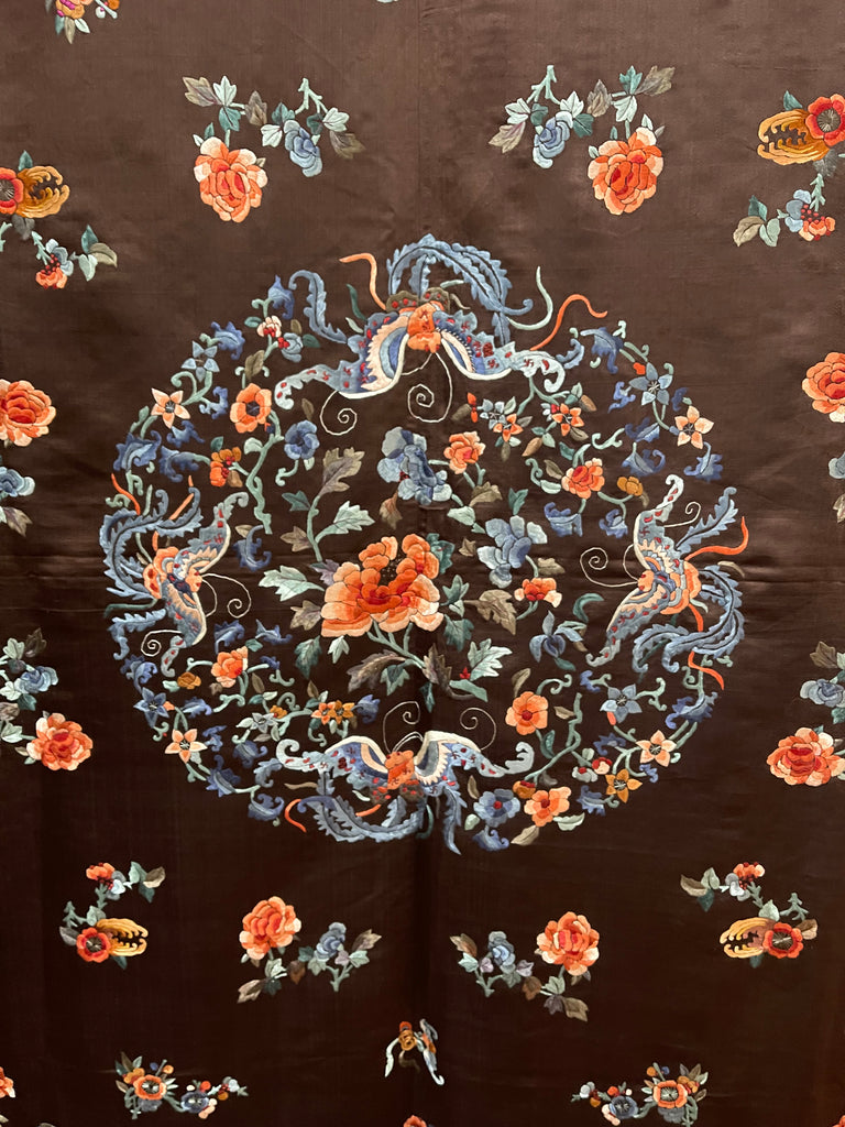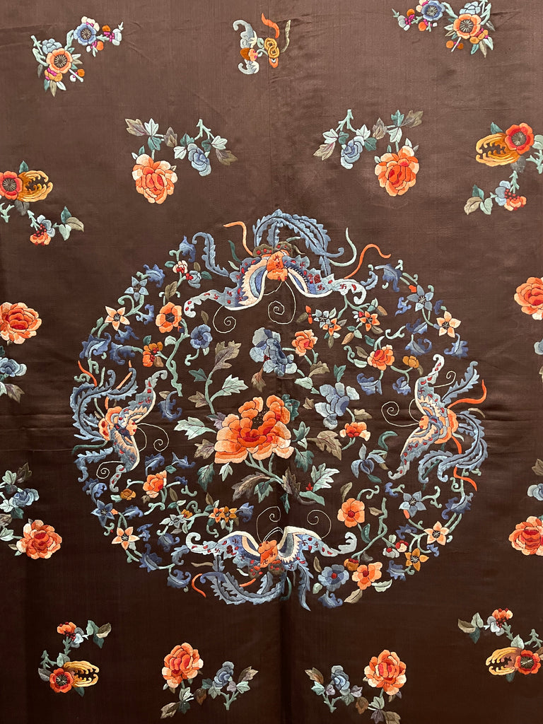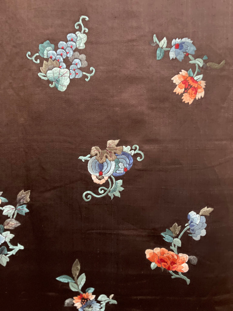 This is surrounded by intricately embroidered pumpkins, peonies and floral motifs embroidered in beautiful muted colours onto a rich brown silk satin ground. This would suit a wide variety of interior settings.