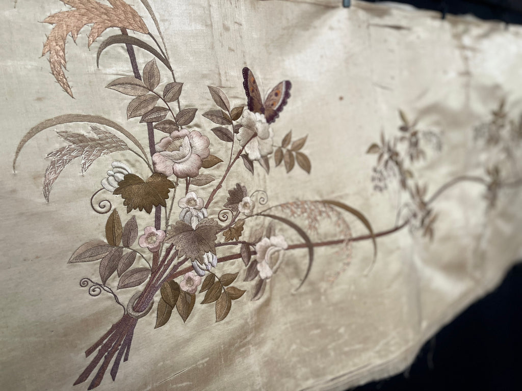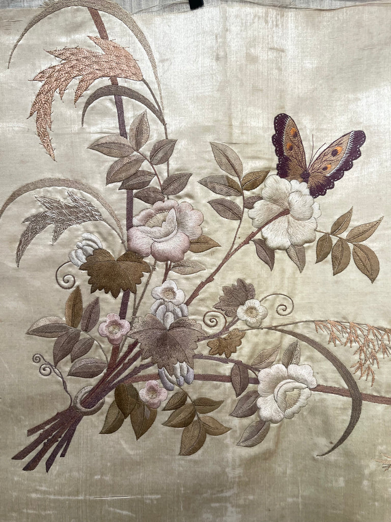 Worked onto a cream silk satin ground in pale neutral colours, this would look wonderful if it was stretched and mounted. A service we offer from our dedicated textile conservation studio. Please ask us for details and a quote.