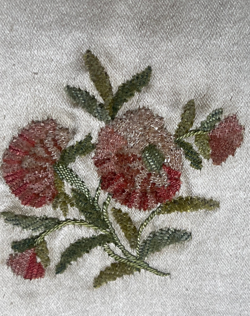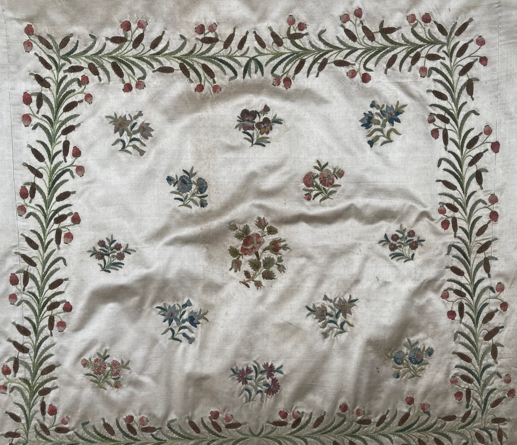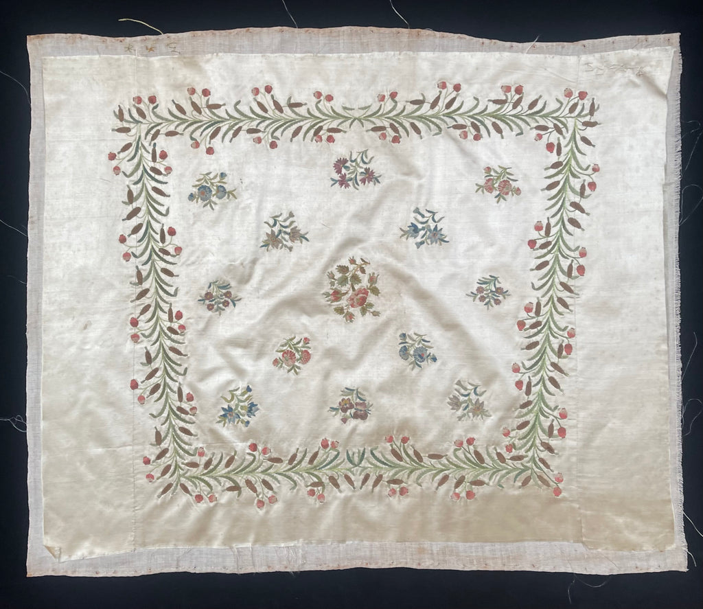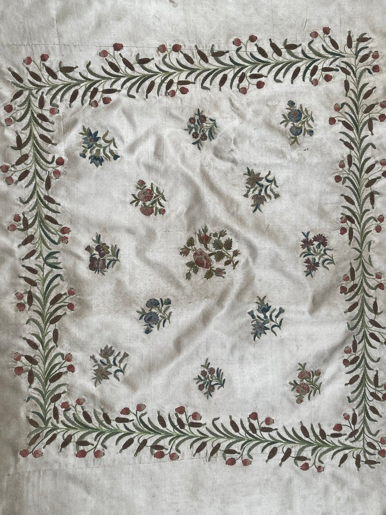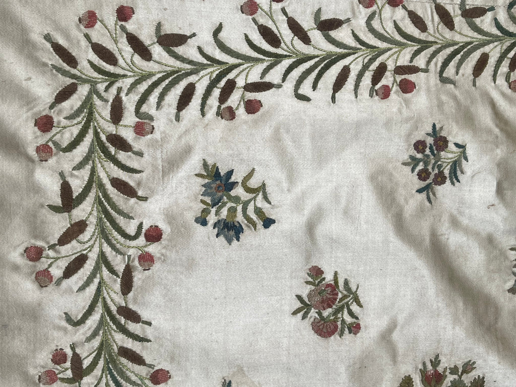 The ground textile is a fine hand loomed silk satin in off white which has been embroidered with chenille in a beautiful floral design with a foliate border.