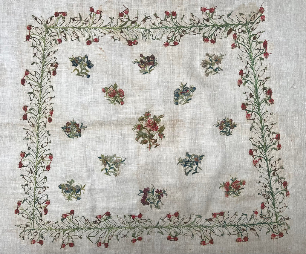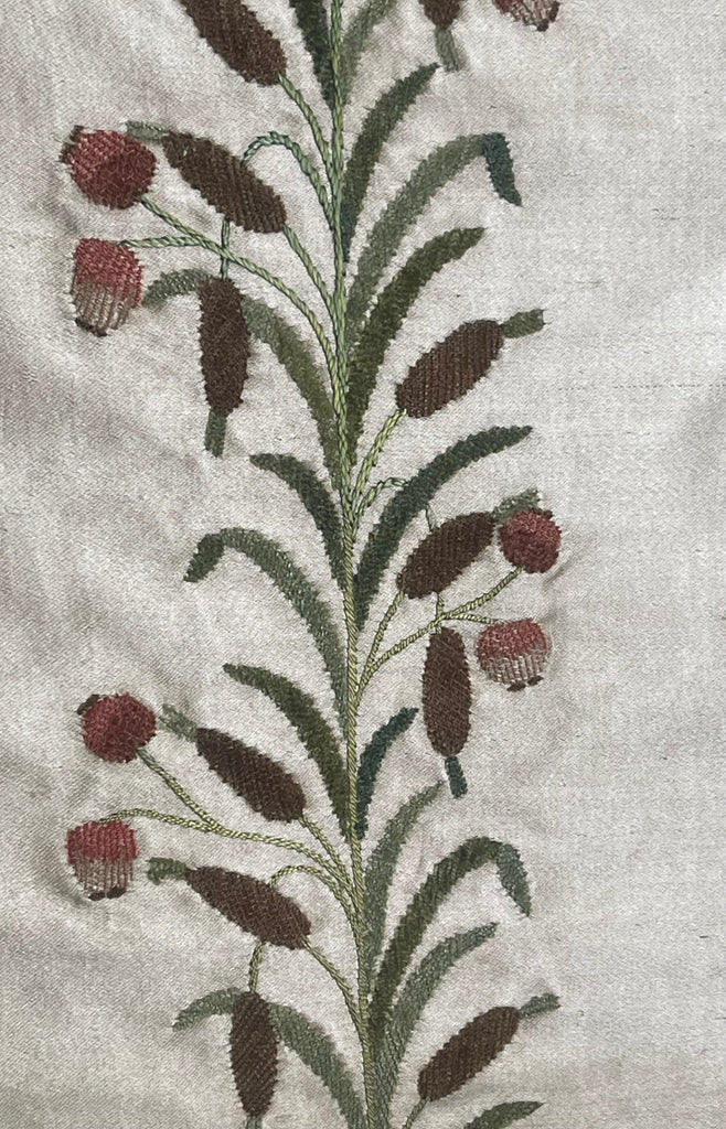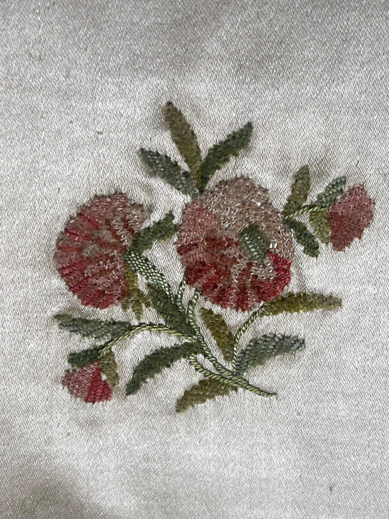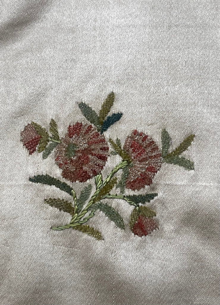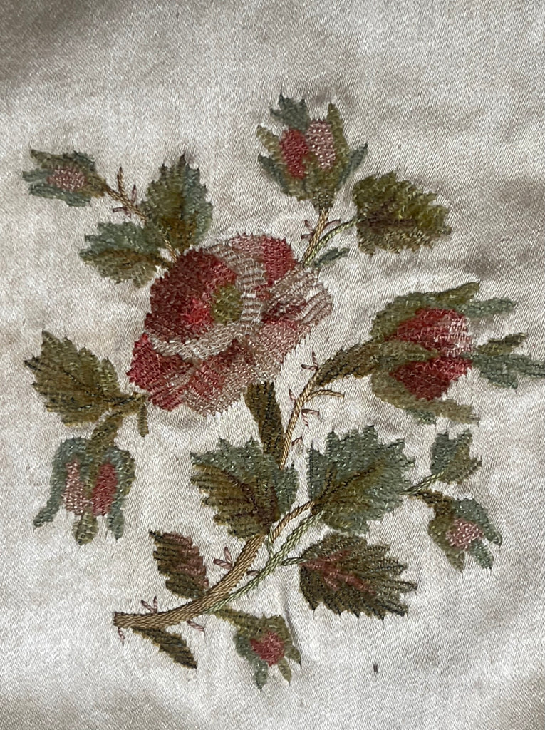 The ground textile is a fine hand loomed silk satin in off white which has been embroidered with chenille in a beautiful floral design with a foliate border.