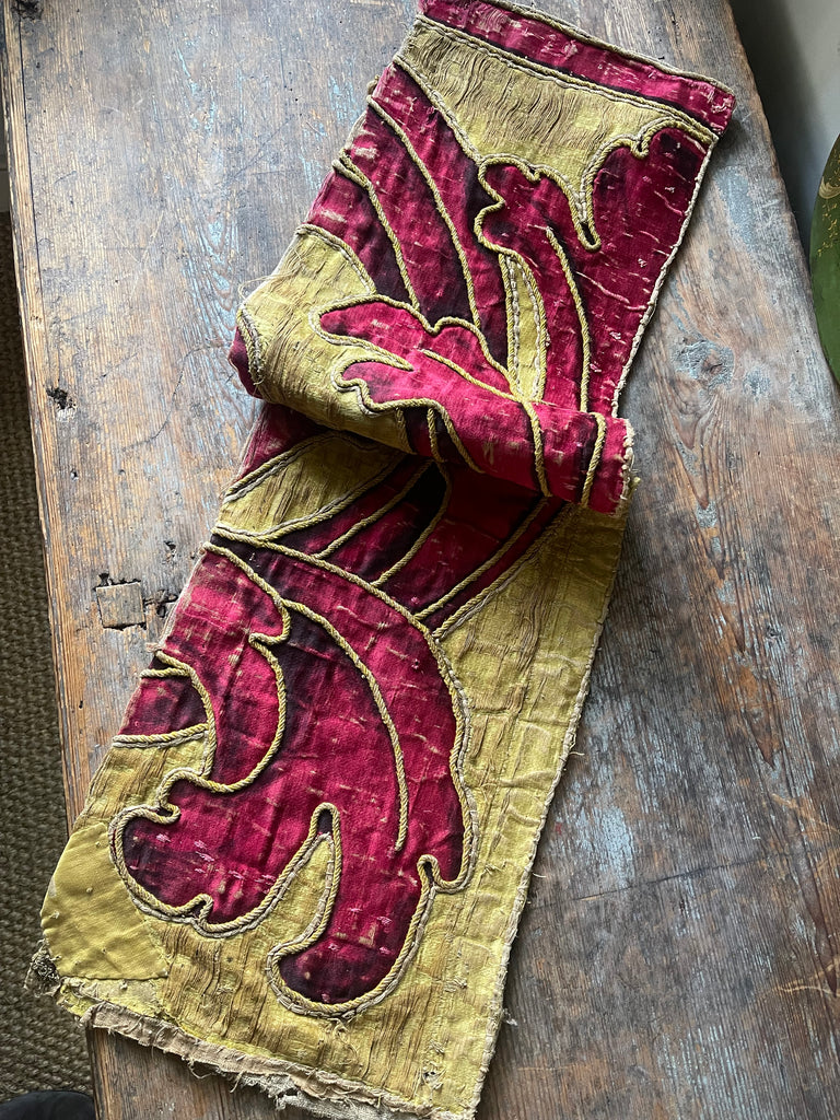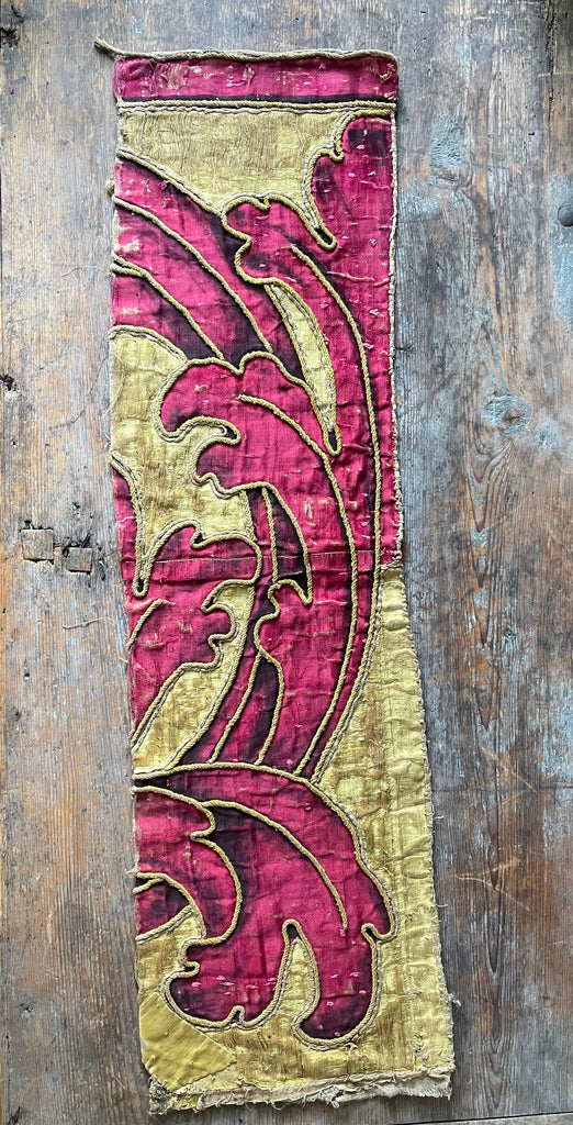 Dating from the 17th century and from Italy, it looks like it was possibly once part of a larger wallhanging or banner, probably made to hang in a church.