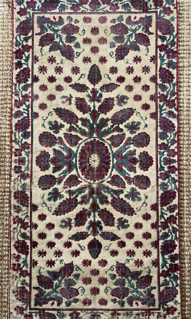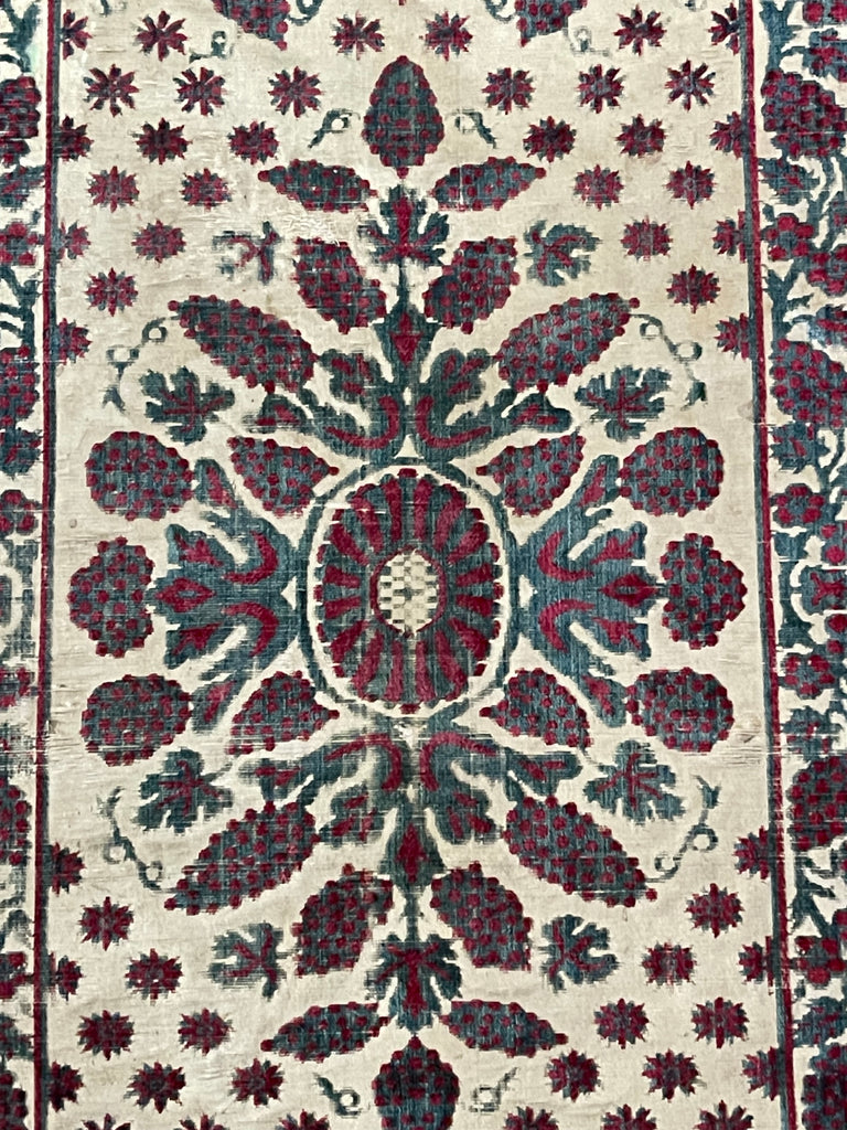 A wonderful textile that displays well on a wall. We specialise in stretching and mounting textiles in our dedicated textile conservation studio. Please ask us for details.