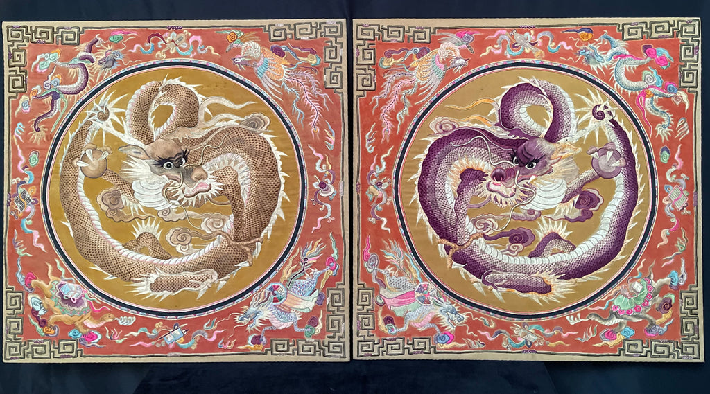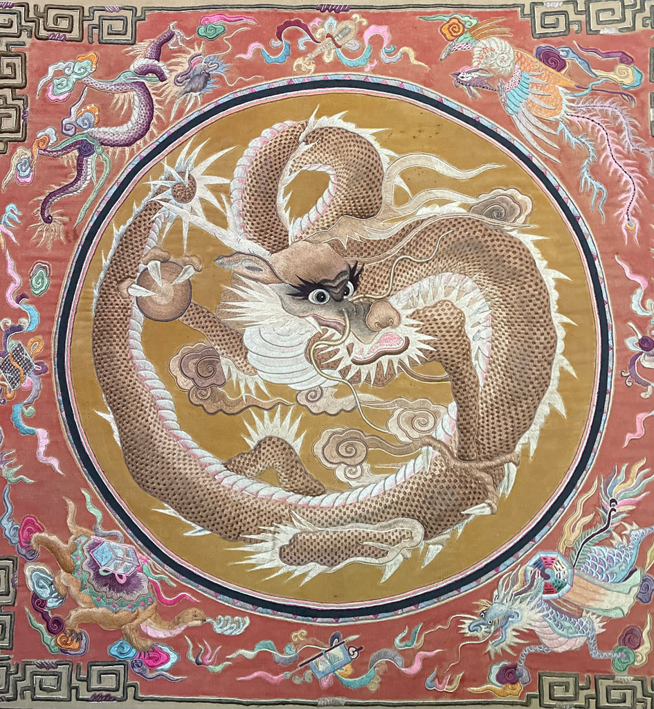 An absolutely stunning museum worthy silk embroidery of a dragon chasing a pearl dating from the early 1900s, China. The dragon represents prosperity and rain, while the flaming pearl signifies spiritual energy, wisdom, and knowledge.