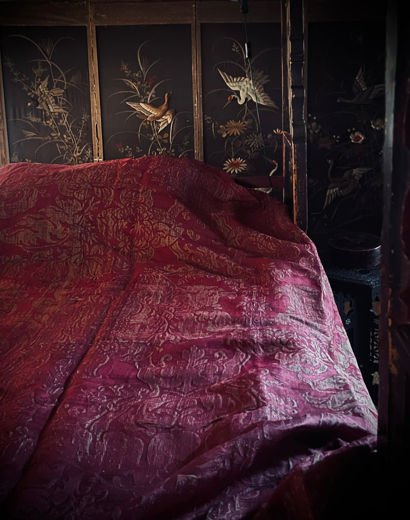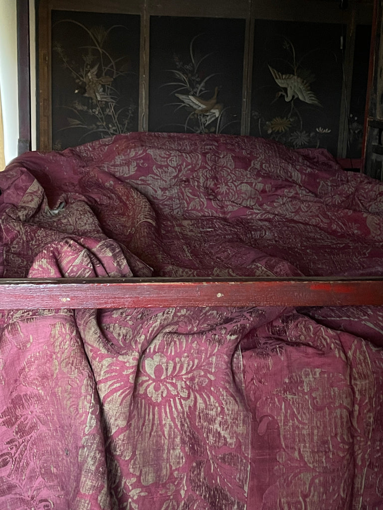 with stylised exotic floral and plant motifs there’s enough silk here for a good sized bedcover as shown here.