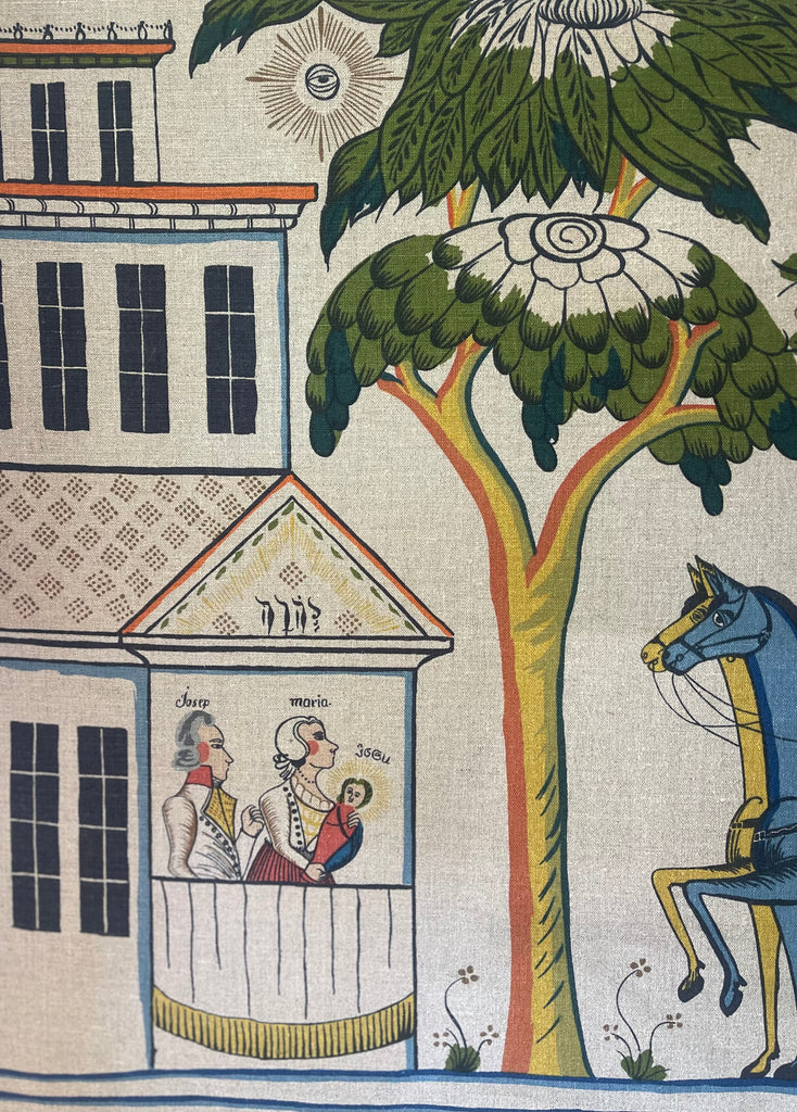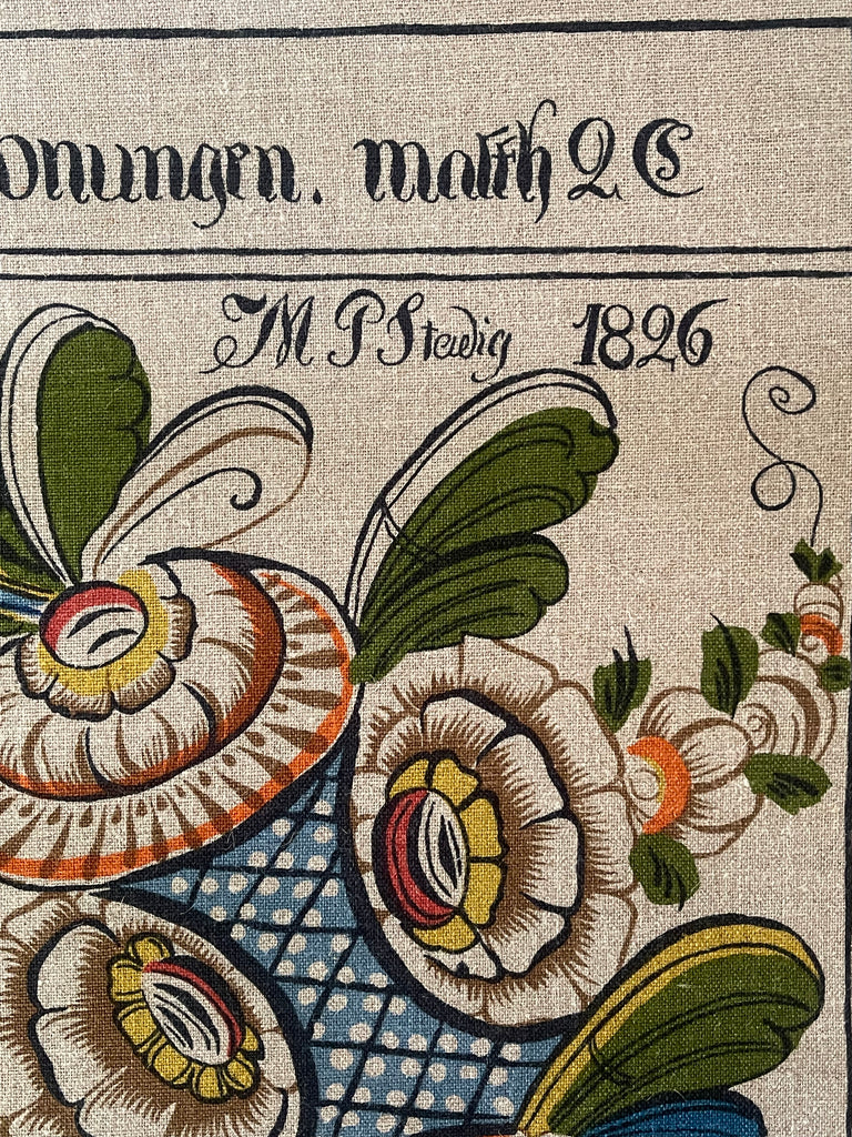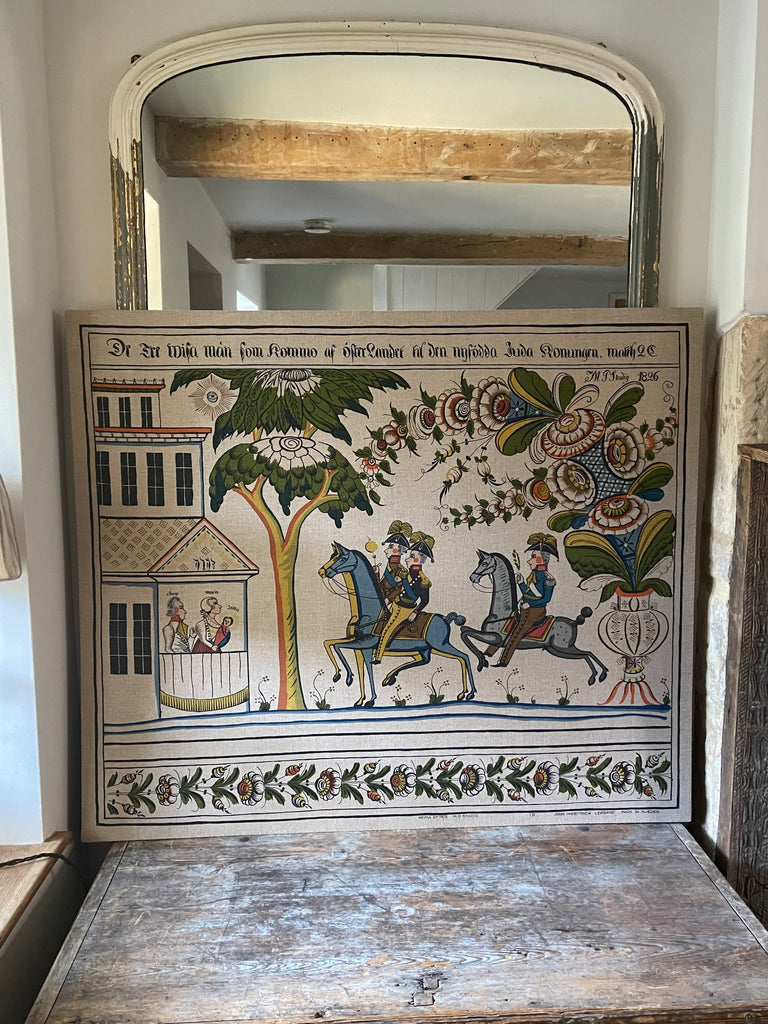 Large Swedish Folk Art Print Linen Wall Hanging: C1950s translation 19th Century Wall Paintings, Sweden