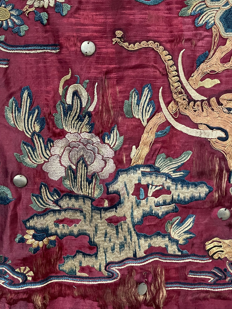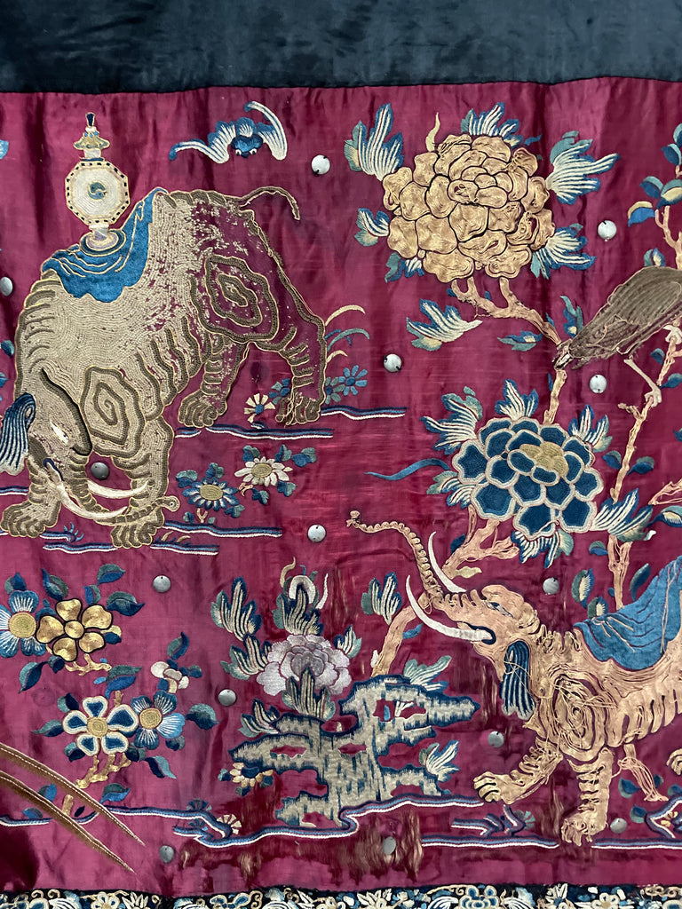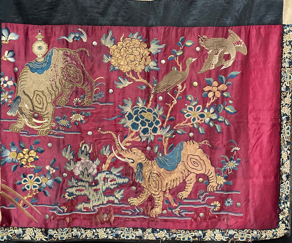 Skillfully hand embroidered onto a magenta silk satin ground with coloured silks using a wide variety of stitches unusually it depicts two elephants worked in gold wrapped thread, a scholars rock, flowers, a bat and other traditional symbolic motifs.