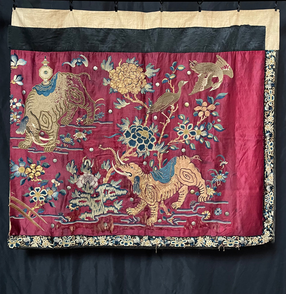Antique Gilt Thread and Silk Embroidery with Elephants: C19th China